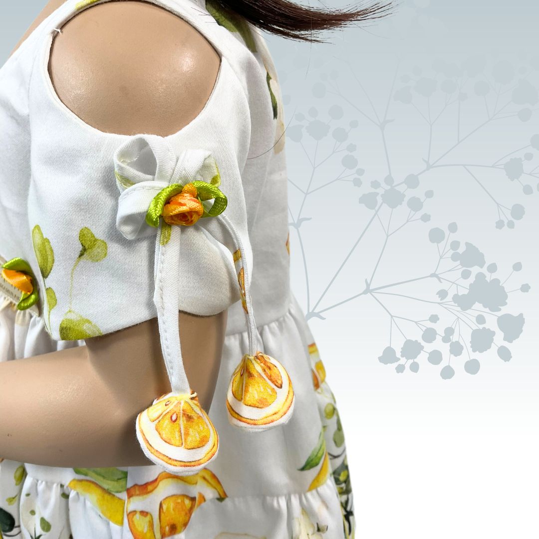 Die Minni Blomma sieht so aus, hier haben wir auf Rüschen verzichtet, stattdessen ein passendes Röschen aufgenäht und die Zitronenhälften sind die hübschen Baumler geworden, die entzückend aussehen. Das hatte sich einfach so angeboten.