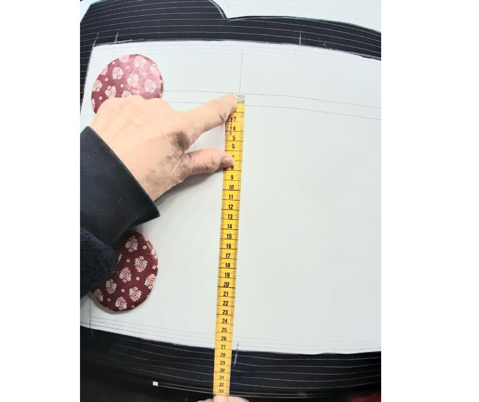 Zum Ausrichten des Fadenlaufes misst Du erst im oberen Teil des Schnittes vom Fadenlauf bis zur Webkante – notierst Dir das Maß und beschwerst zugleich den Schnitt, damit er nicht mehr verrutschen kann. Sollte der Fadenlauf nicht durch den kompletten Schnitt gehen, einfach mit einem Lineal über die gesamte Schnittlänge verlängern