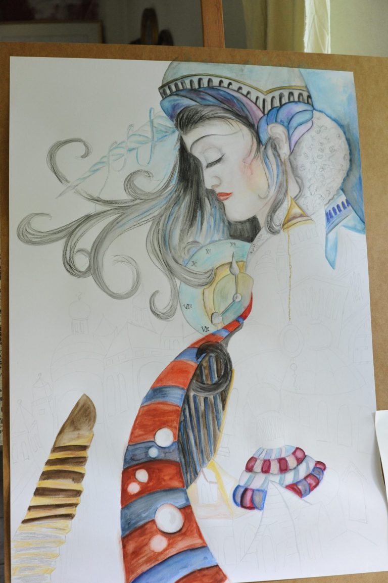 Ich bevorzuge Gesichter und ich male für mein Leben gern kleine, schiefe, alte Häuser. Und genau diese beiden Themen werde ich im Triptichon umsetzen. Ich habe mich für Aquarell entschieden, weil das für mich die perfekten Malutensilien sind.