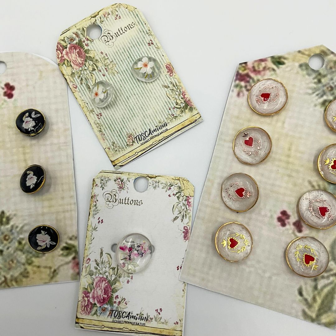 Erinnert ihr euch noch an die Knopfkärtchen, auf denen früher Knopfsortimente aufgenäht waren? Während ich meine eigenen Knöpfe produzierte, fiel mir diese Idee wieder ein. Also habe ich meine eigenen Knopfkärtchen hergestellt und meine Knöpfe darauf aufgenäht. Es sieht einfach toll aus und weckt nostalgische Gefühle. Ich liebe es, wie diese kleinen Details meine Arbeit aufwerten und für eine besondere Note sorgen.