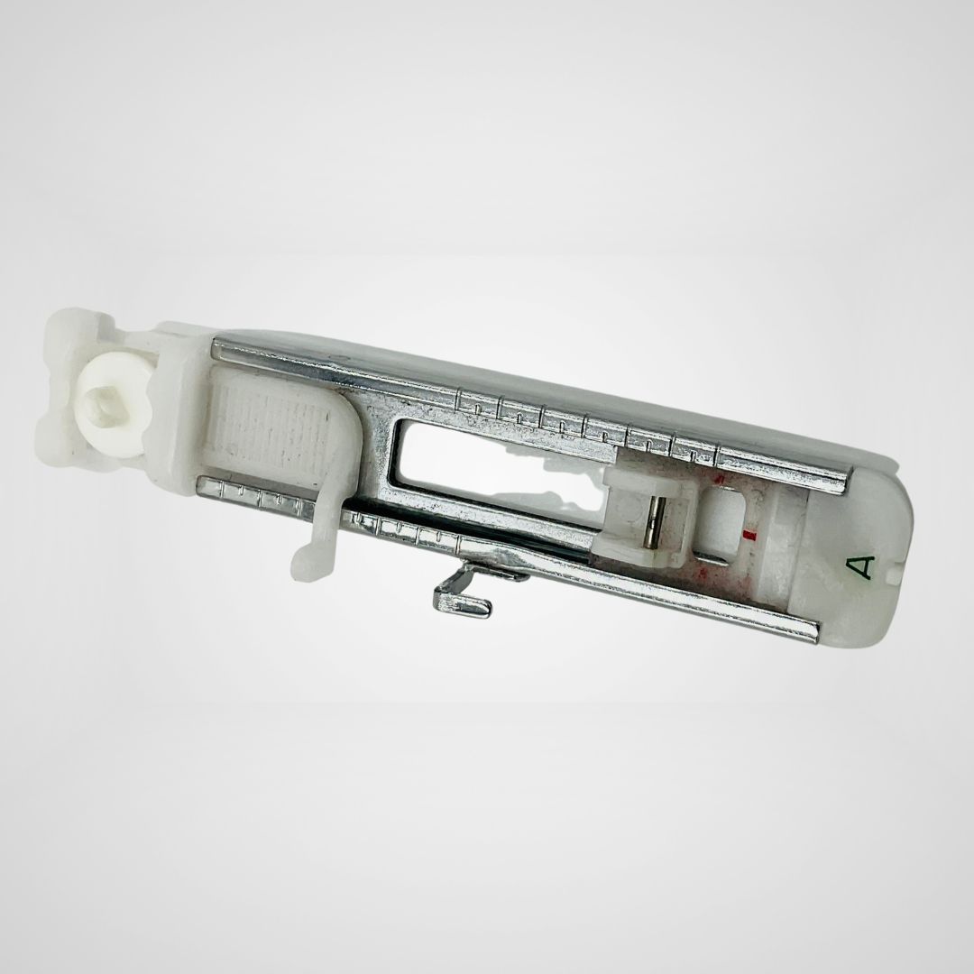 Wir nähen unsere Knopflöcher mit einer Brother/Innovis Maschine/Knopflochautomatik (falls Du im Besitz einer solchen sein solltest).  Mit Knopflochautomatik brauchst Du nur die Position der Knopflöcher zu markieren (Startpunkt ebenfalls 3mm vor der vorderen Mitte). Wenn Du eine Knopflochautomatik an Deiner Nähmaschine besitzt, sieht der Knopflochfuß, ähnlich wie auf dem unteren Bild aus – dieser ist beispielsweise von einer Brothermaschine. Hinten wird der Knopf eingelegt. Der Fuß sorgt automatisch dafür, dass das Knopfloch die richtige Länge des Knopfes hat. Wenn der Fuß in der Nähmaschine montiert ist, wird ein Hebel herunter gezogen und der steuert die Länge des Knopfloches. Hast Du keine Knopflochautomatik, zeichnest Du Deine Knopflöcher in der kompletten Länge an, wie oben beschrieben und bestimmst, meistens mit Umschalten von vorwärts und Rückwärts nähen, die Länge des Knopfloches selbst.