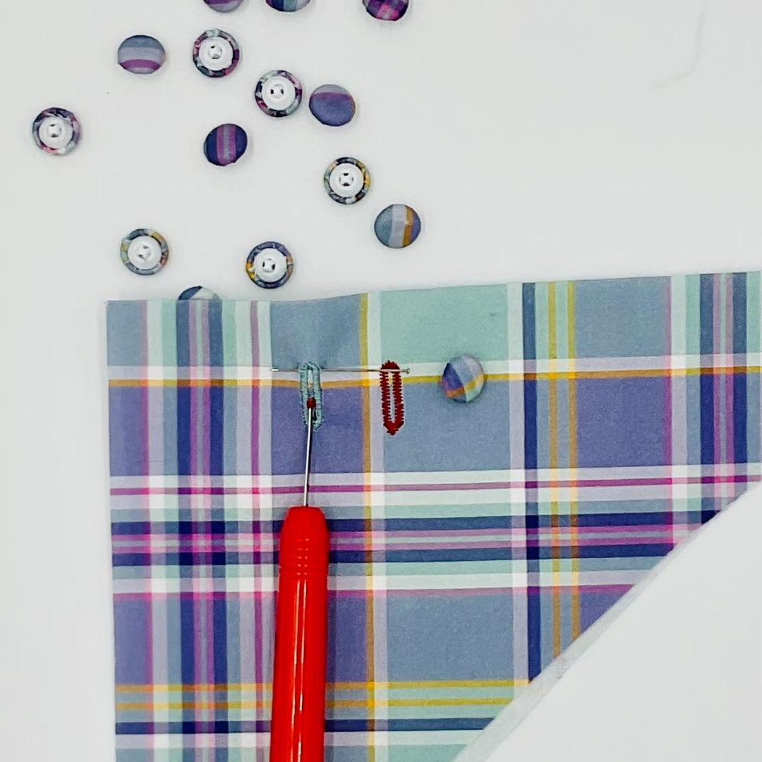 Wir haben hier übrigens überziehbare Knöpfe verwendet – wir finden es immer sehr edel, wenn die Knöpfe das Stoffmuster des Kleidungsstückes haben. Das Überziehen geht ganz leicht und die Rohlinge nebst Werkzeug bekommst Du z.B. bei Prym.