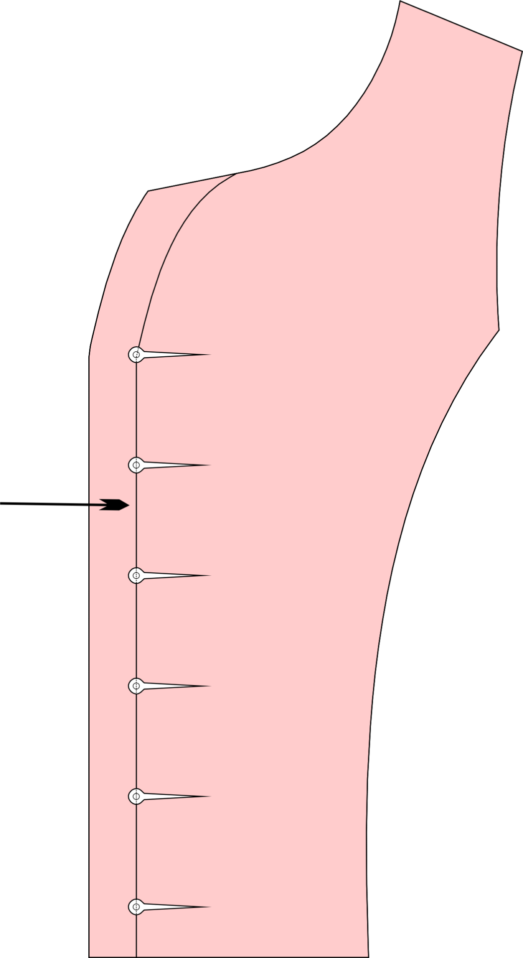Hier siehst Du einen Ausschnitt aus dem Vorderteil vom Kleid Monika. Du markierst die vordere Mitte, wie für das Teststück bereits beschrieben. Die Knopflöcher werden 3mm vor der vorderen Mitte angezeichnet. Die Knopflöcher werden komplett angezeichnet. (Kreise, löslicher Marker oder Heftfaden). Achte darauf, dass keine Restfarben auf dem Stoff zurück bleiben.