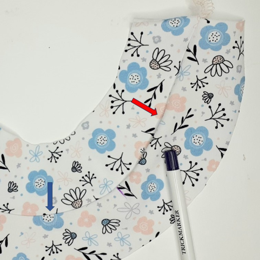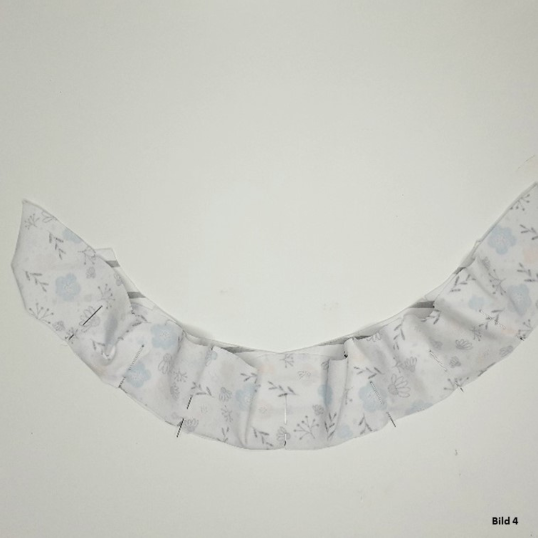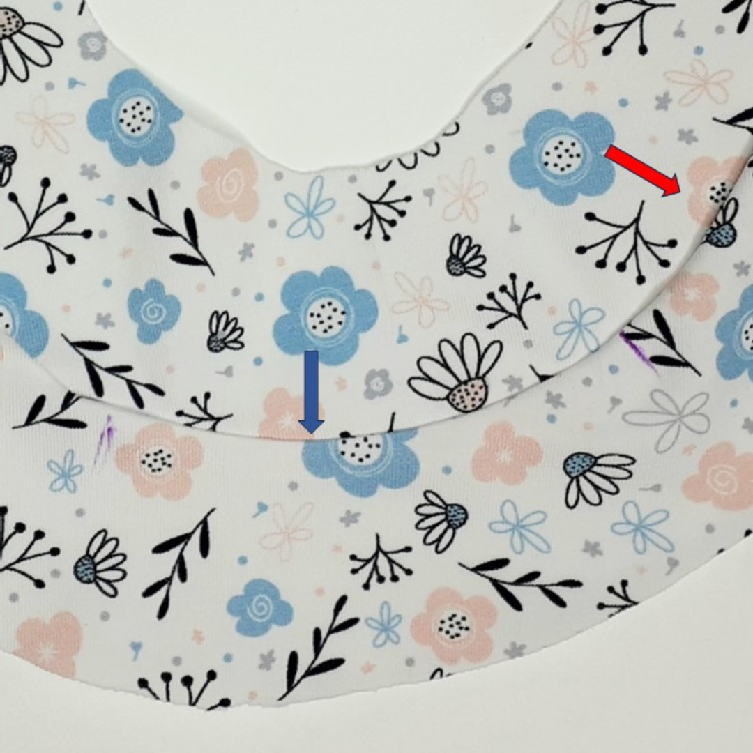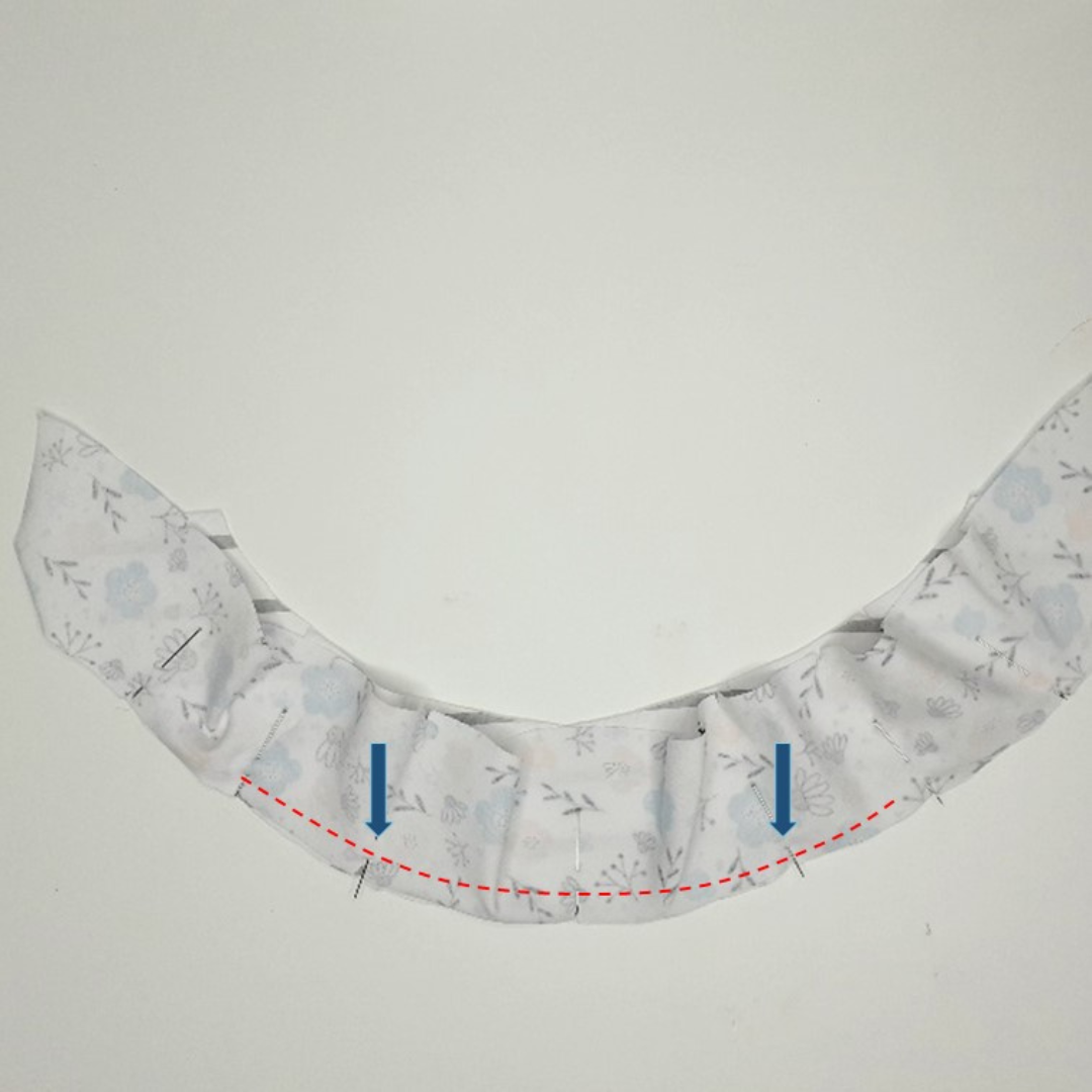 Hier liegt der kleine, also kurze Bogen, oben und der große Bogen (mit mehr Stoff) unten – wenn man den Bogen nun feststeckt (siehe rot gestrichelte Linie), dann dehnst Du ihn automatisch aus.