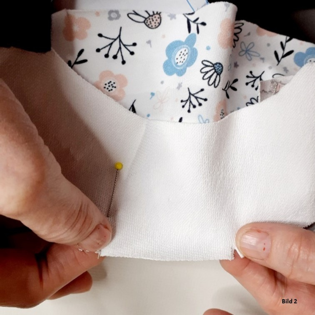 Der größere Bogen wird nun auf den kleineren Bogen gesteckt. Die Rundung des oberen Bogens hat mehr Stoff und dieser lässt sich leichter um die Rundung legen. Würdest Du den großen Bogen unten und den kleinen Bogen oben haben und zusammenstecken, dann würde der Bogen zu stark gedehnt und es gibt unschöne Buckel im Stoff.