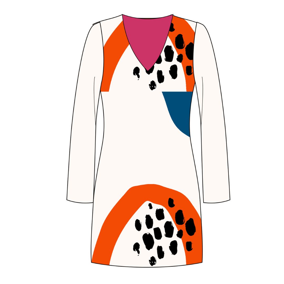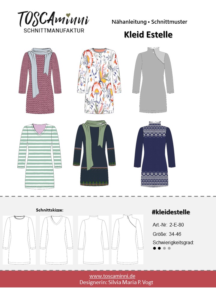 Mit dem Schnittmuster Estelle nähst Du ein schlichtes aber doch wirkungsvolles Jerseykleid. Das Kleid kannst Du in verschiedenen Varianten nähen: Langarm, kurzarm oder 3/4-Arm, runder Ausschnitt, V-ausschnitt oder Turtleneck. Je nach Accessoires verleiht Dir das Kleid einen frechen oder eleganten Look. Der Schnitt ist minimalistisch und verträgt daher opulente Stoffe.