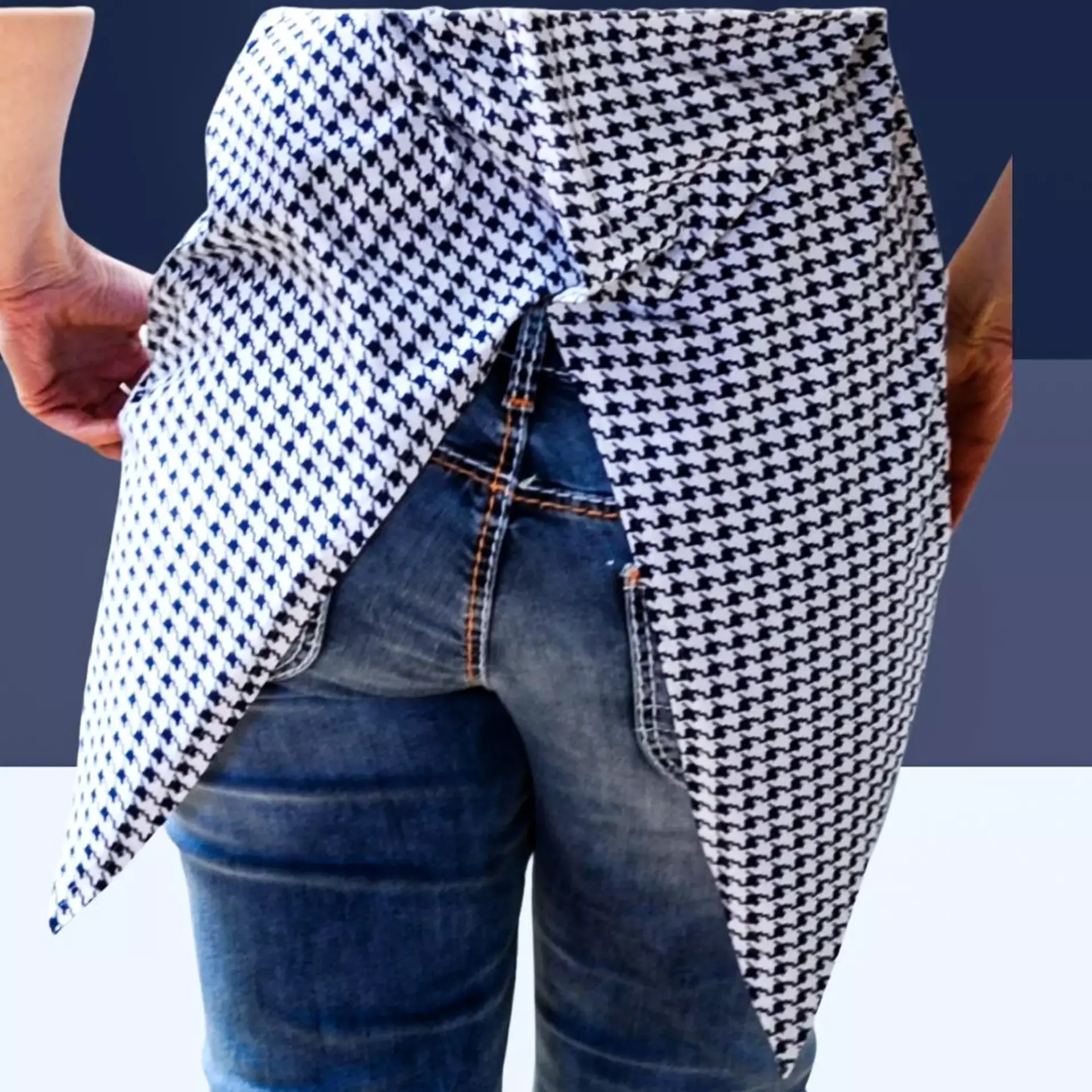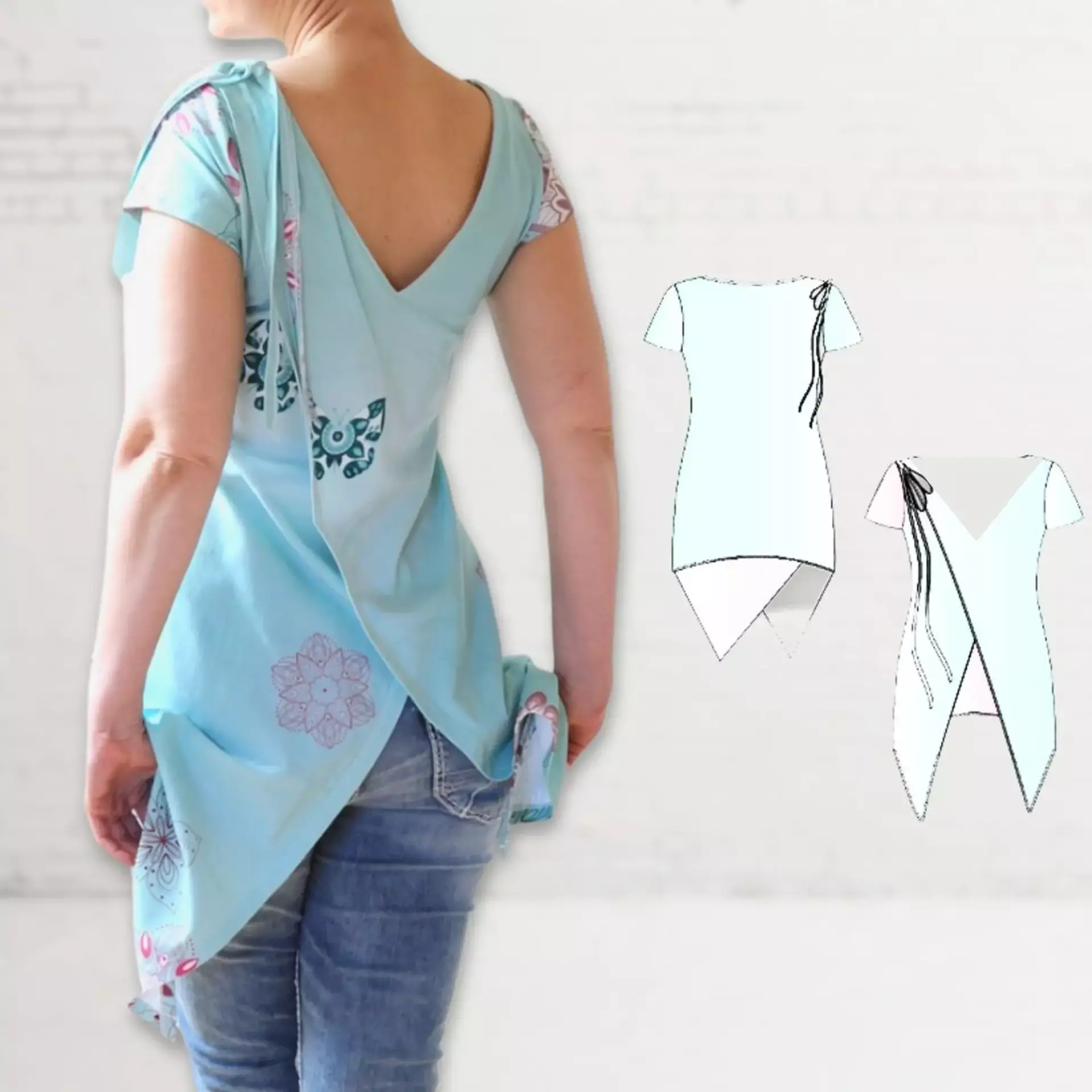 Der Hingucker an diesem Shirt ist das Rückenteil, welches geteilt und überlappend konstruiert ist, so dass eine Wickeloptik entsteht. Der Shirt-Schnitt ist asymmetrisch geschnitten – vorne kurz – die Rückseite extra lang – als Extra sind die beiden Enden in Zipfeloptik gehalten.