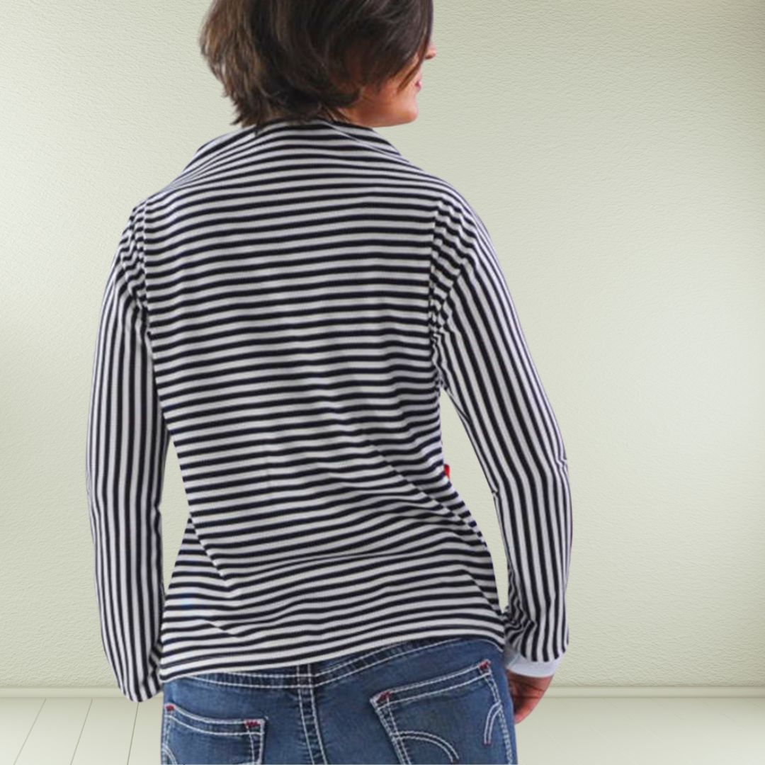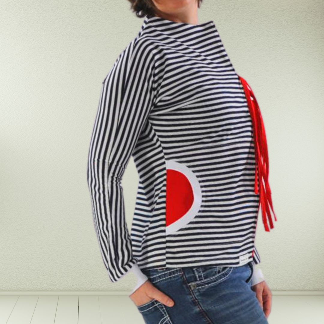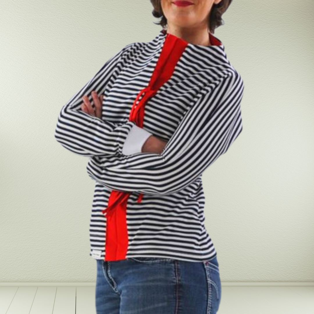 Mit dem Schnittmuster Jule nähst Du Dir die Version von „Jule+Fin“ für Erwachsene. Das Shirt wirkt raffiniert durch den vorderen Einsatz und dient als optischer Hingucker. Sportlich wirkt der angeschnittene Kelchkragen. Als Fake-Verschluss dienen Bindebändchen oder Knöpfe oder was immer Dir einfällt.