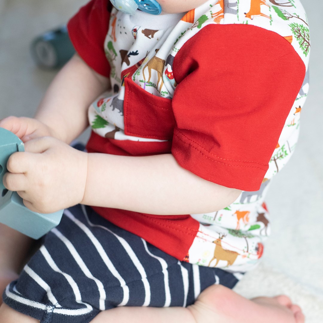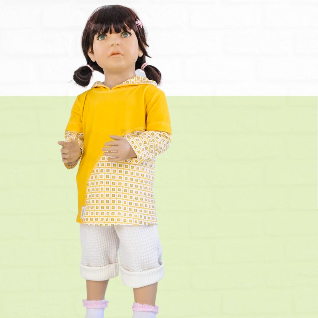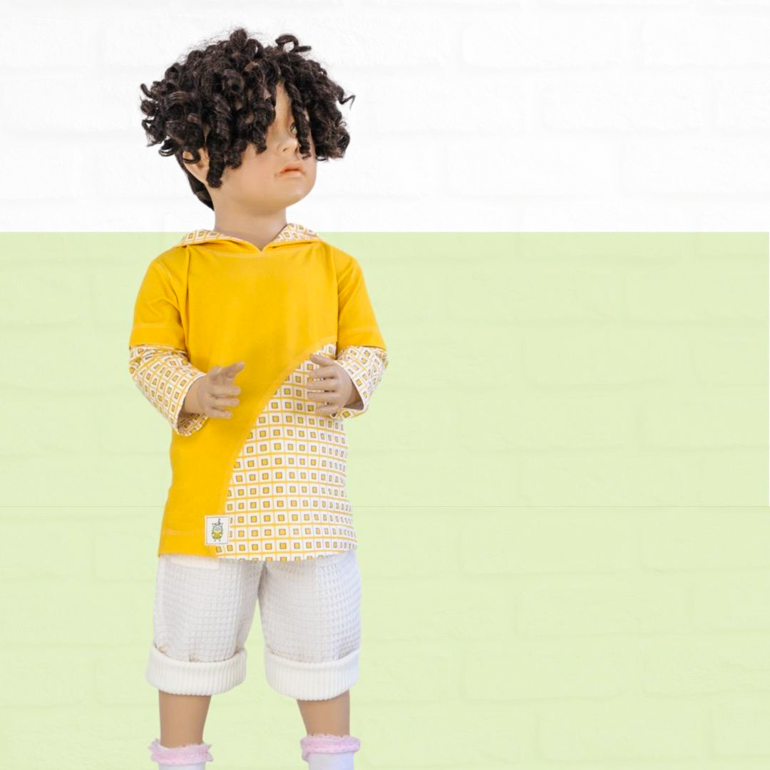 Das Schnittmuster für das Kindershirt Luca ist ein Basic-Schnitt für Jungs und Mädchen. Du kannst das Shirt aus einer Variation von Einzelteilen zusammensetzen. Wähle einen Korpus, zum Beispiel mit Teilungsnaht und nähe das Shirt mit Stehkragen, Kapuze oder Bündchen – langarm – kurzarm. Ebenso sind verschiedene Taschen mit dabei.