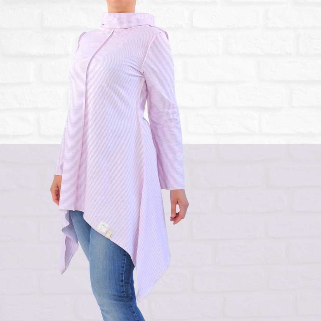 Das Shirt ist in 1-2 Stunden genäht – als besonderer Hingucker ist der Katwisestil gedacht – die Nähte liegen außen. Deshalb wäre es gut, wenn der Pullover mit einer Overlock genäht werden könnte.