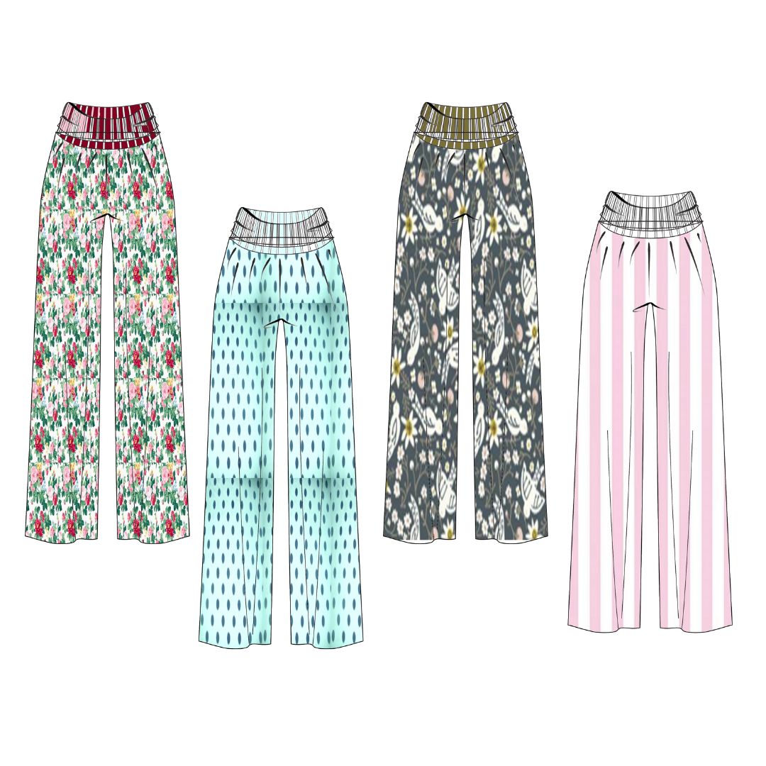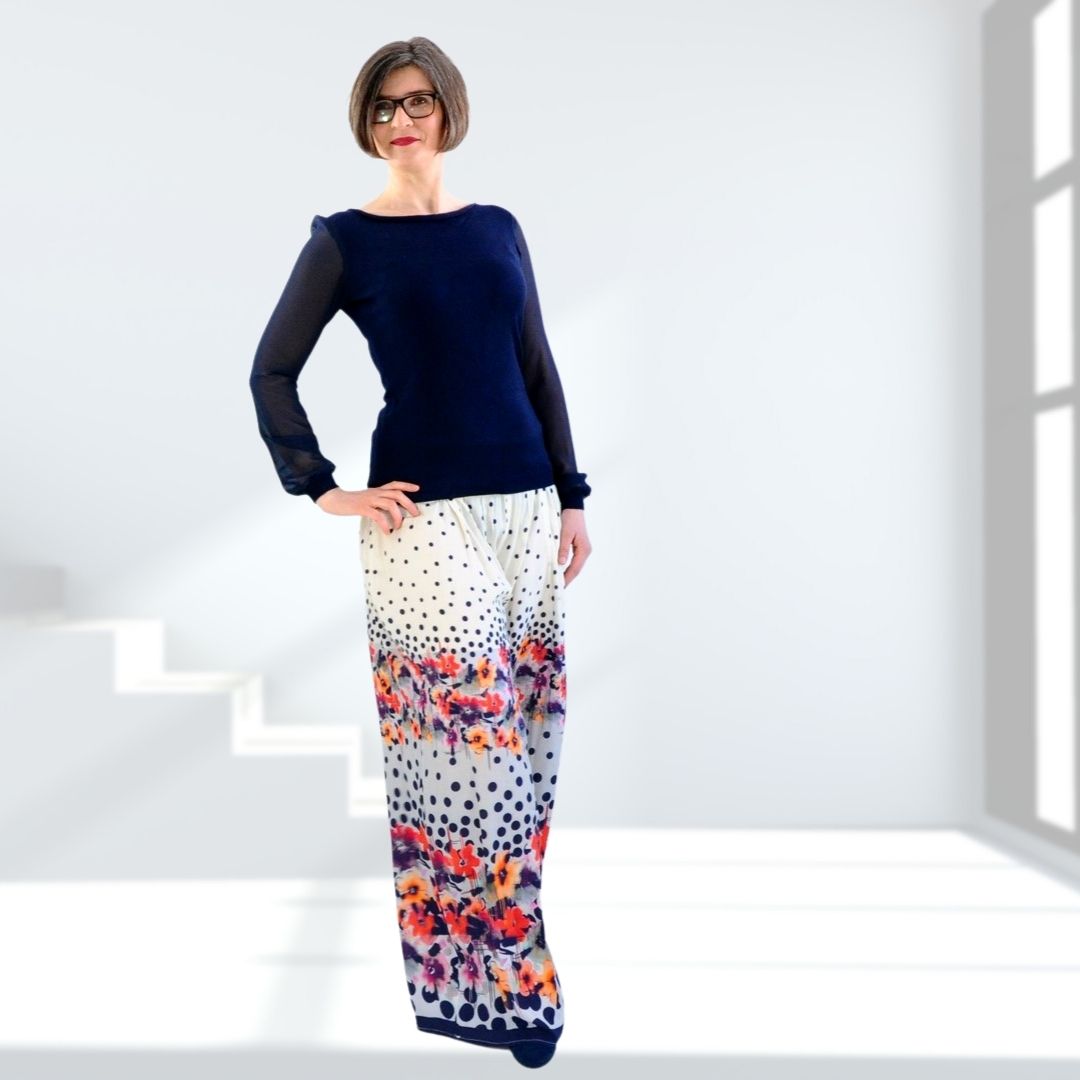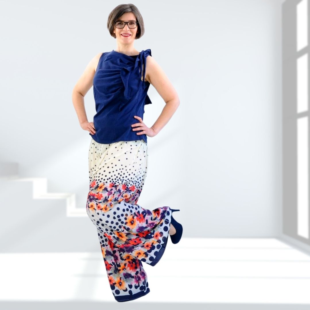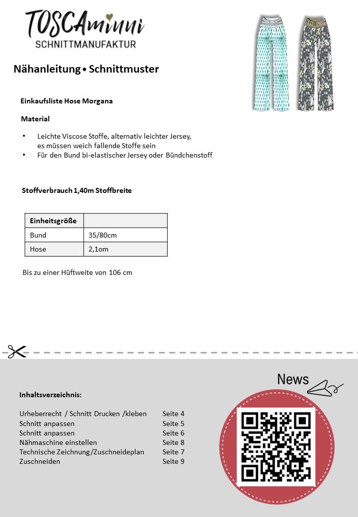 Das Schnittmuster Morgana ist eine einfach zu nähende Hose im Marlene-Stil. Die Hose verbindet einen flotten Kleidungsstil mit angenehmen Trageeigenschaften. Es sollten leichte Viscosestoffe oder Baumwollstoffe, z.B. Musselin gewählt werden. Dünne Jerseystoffe kannst Du auch verwenden.