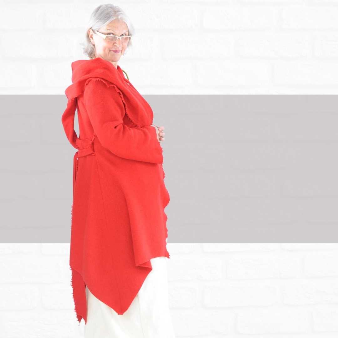 Der Hingucker der Jacke ist die große Kapuze, die zugleich als Aufschlagkragen dient. Du kannst die Jacke offen tragen oder mit einem Gürtel ganz einfach zubinden. Durch die schlichte Schnittführung passt die Jacke zu allen Modestilrichtungen und ist somit auch ein elegantes Basicteil.