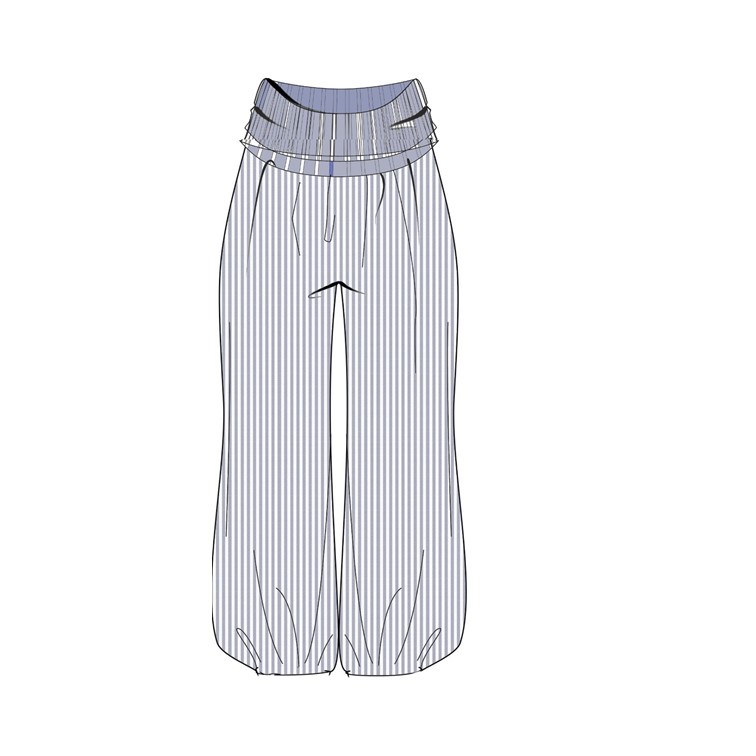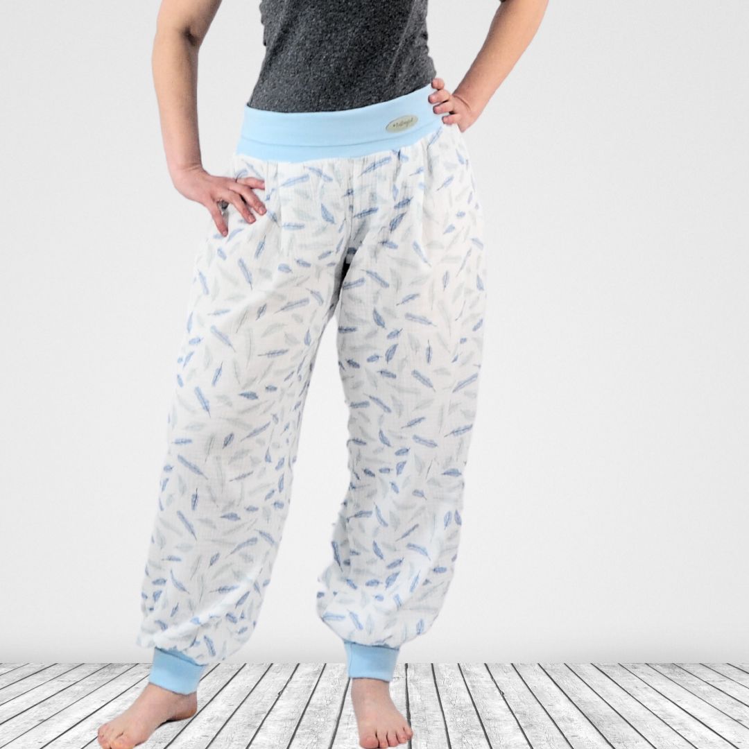 Schnittmuster für eine lässige Jogginghose,Haremshose oder Sarouelhose. Die Hose kann in 2 Varianten genäht werden – Variante 1 ist mit einem Innenfutter versehen, so dass ein leichter Balloneffekt entsteht und für die entsprechende Lässigkeit sorgt. Die abgefütterte Variante ist sehr anspruchsvoll zu nähen. Bei Variante 2 entfällt das Abfüttern und der „Pumphosen-Effekt“ entsteht durch das Anbringen von Beinbündchen. Diese Methode empfehlen wir für Nähanfänger:innen.