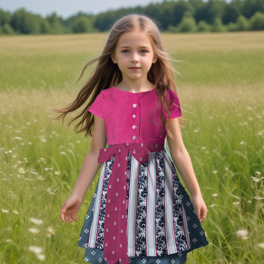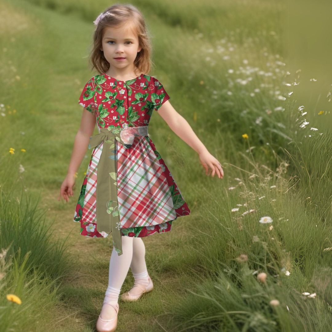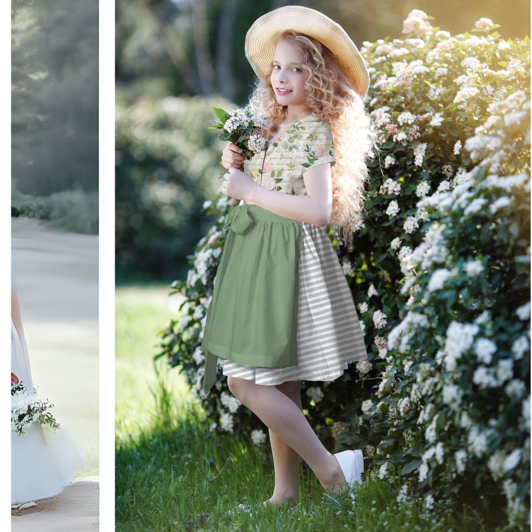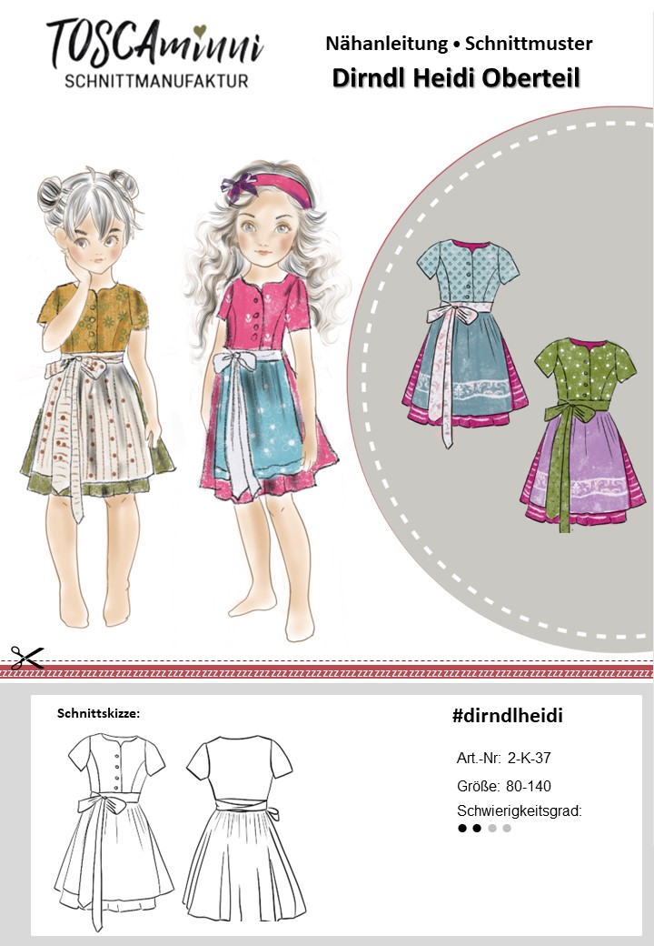 Mit dem Schnittmuster Heidi nähst Du ein bezauberndes Kinderdirndl, das Tradition und Moderne gekonnt verbindet. Das Dirndl besticht durch seine Wiener Nähte im Vorderteil, die für eine schmeichelnde Passform sorgen. Die kurzen Ärmel machen eine separate Dirndlbluse überflüssig und verleihen dem Kleid einen frischen Look. Der eingereihte Rock und die ergänzende Schürze runden das klassische Trachtenoutfit perfekt ab.
