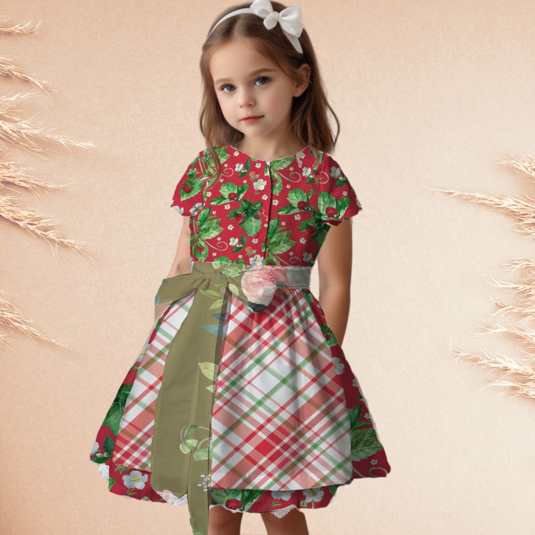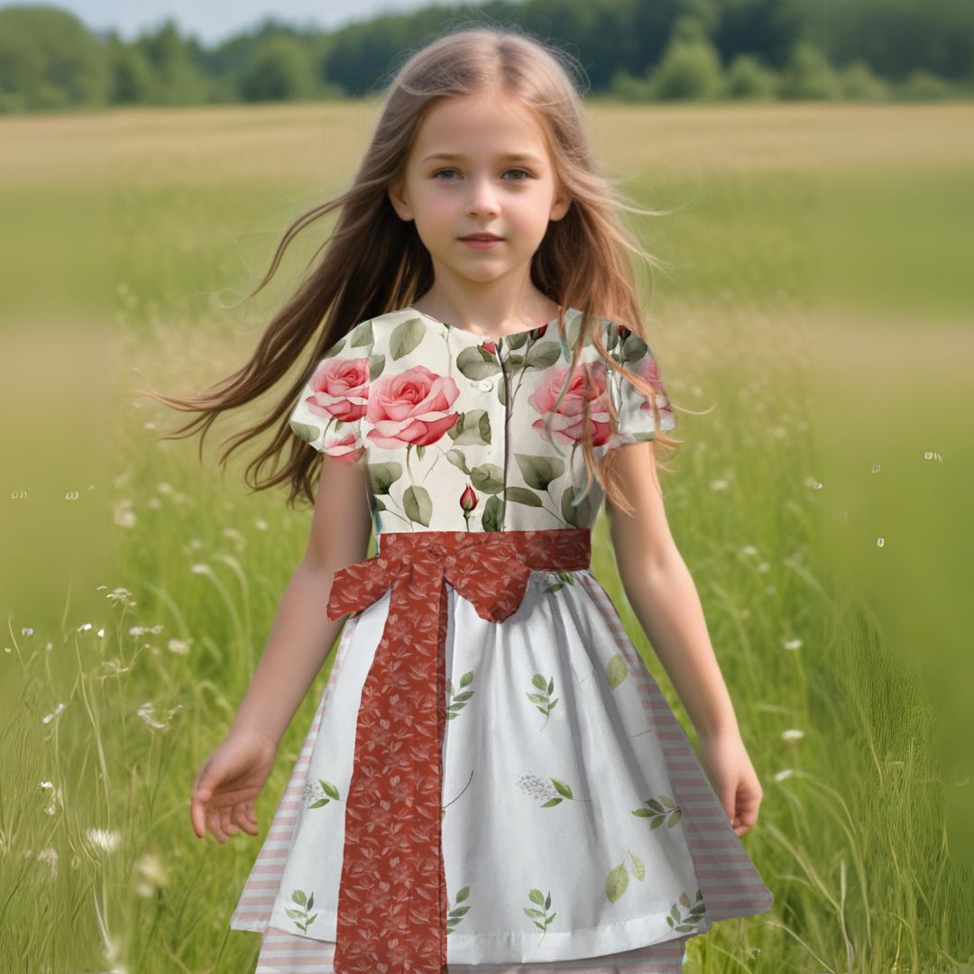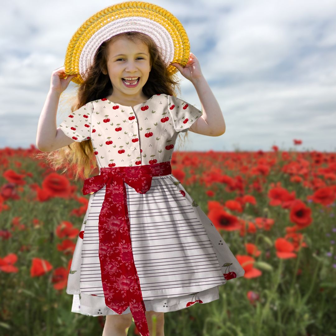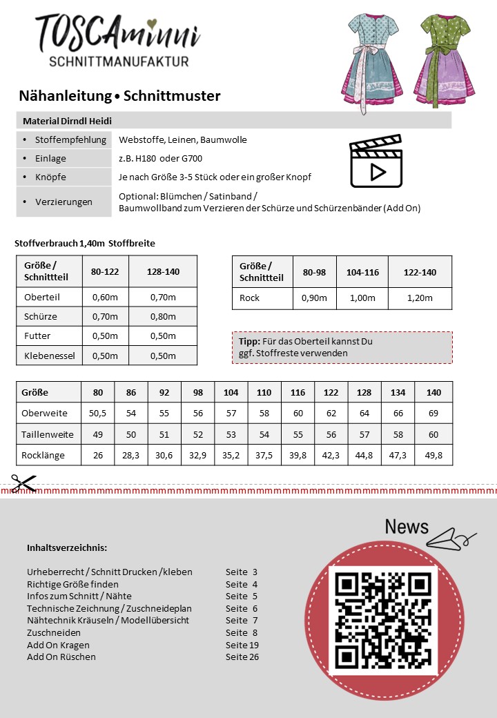 Mit dem Schnittmuster Heidi nähst Du ein bezauberndes Kinderdirndl, das Tradition und Moderne gekonnt verbindet. Das Dirndl besticht durch seine Wiener Nähte im Vorderteil, die für eine schmeichelnde Passform sorgen. Die kurzen Ärmel machen eine separate Dirndlbluse überflüssig und verleihen dem Kleid einen frischen Look. Der eingereihte Rock und die ergänzende Schürze runden das klassische Trachtenoutfit perfekt ab.