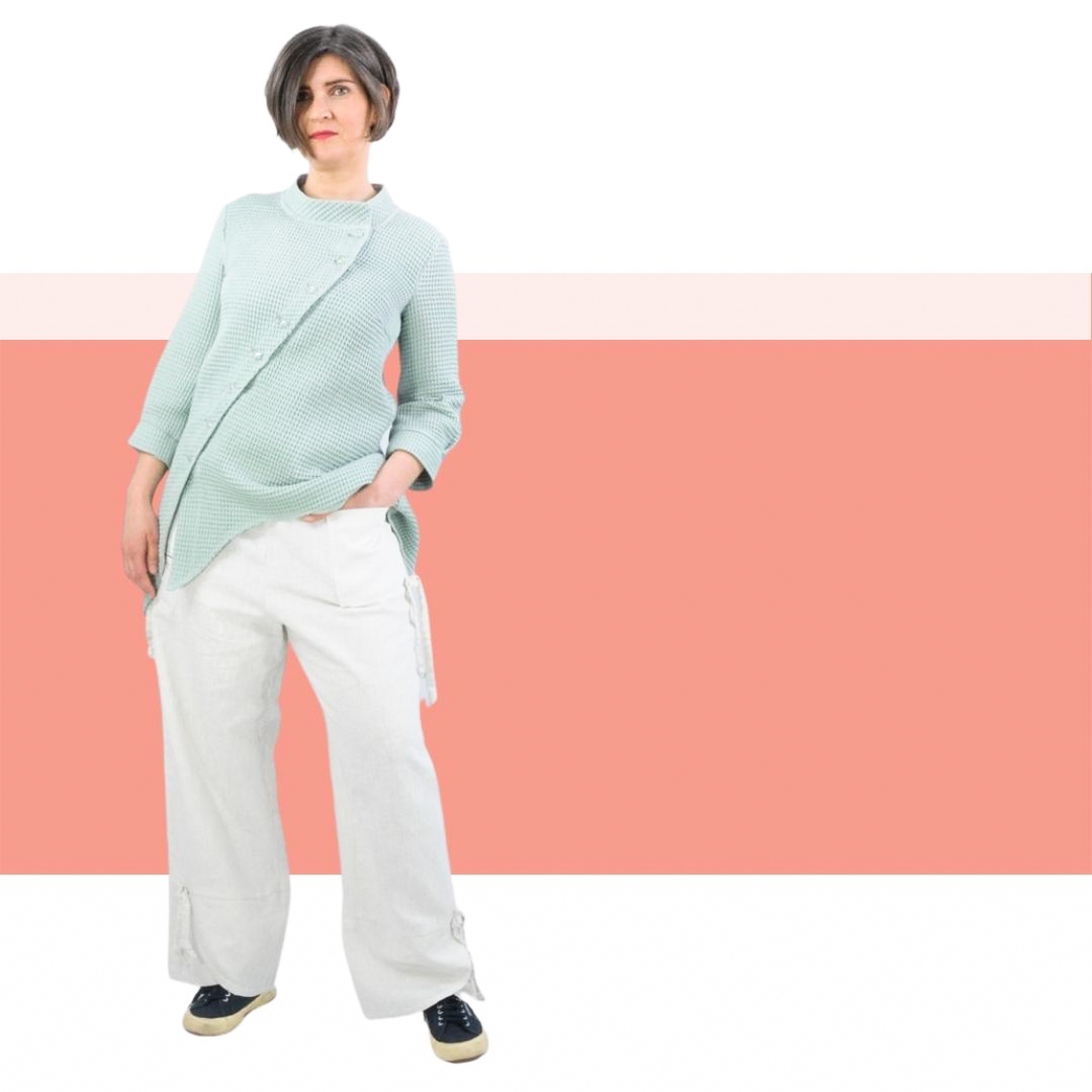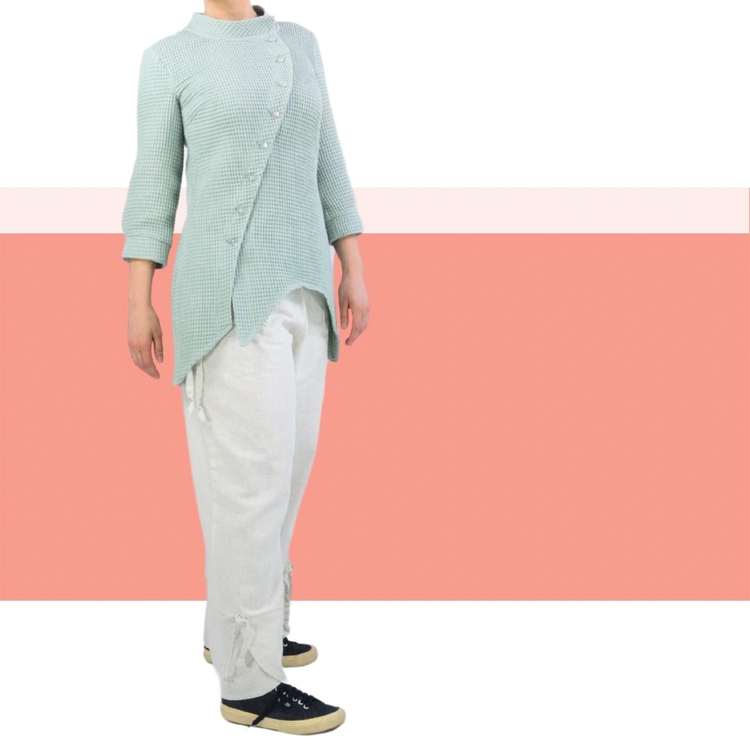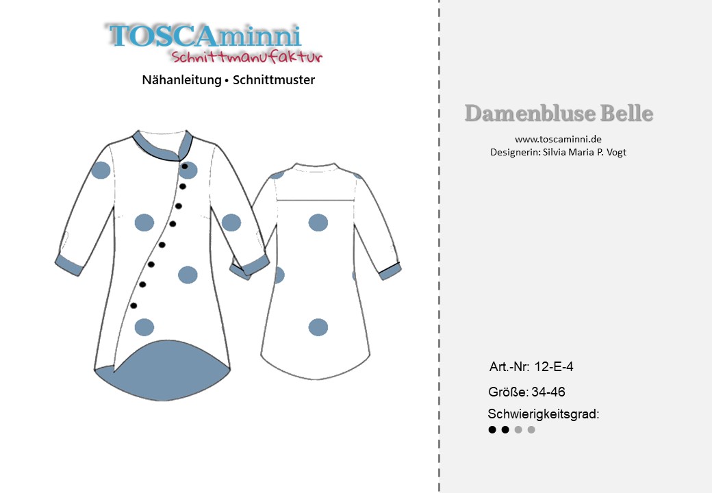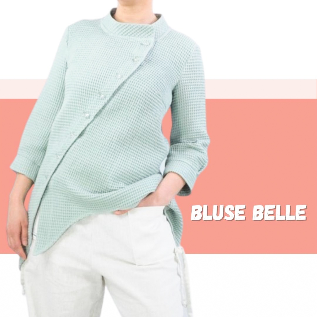 Das Schnittmuster Belle ist eine asymetrisch geschnittene Longbluse. Der asymetrische Knopfverschluß besticht die Schnittführung und sieht super toll zu Hosen und zu Jeans aus. Ein Stehkragen rundet die Ansicht ab. Die Ärmel sind nicht ganz lang und mit angenähten Bündchen/Manschetten versehen.