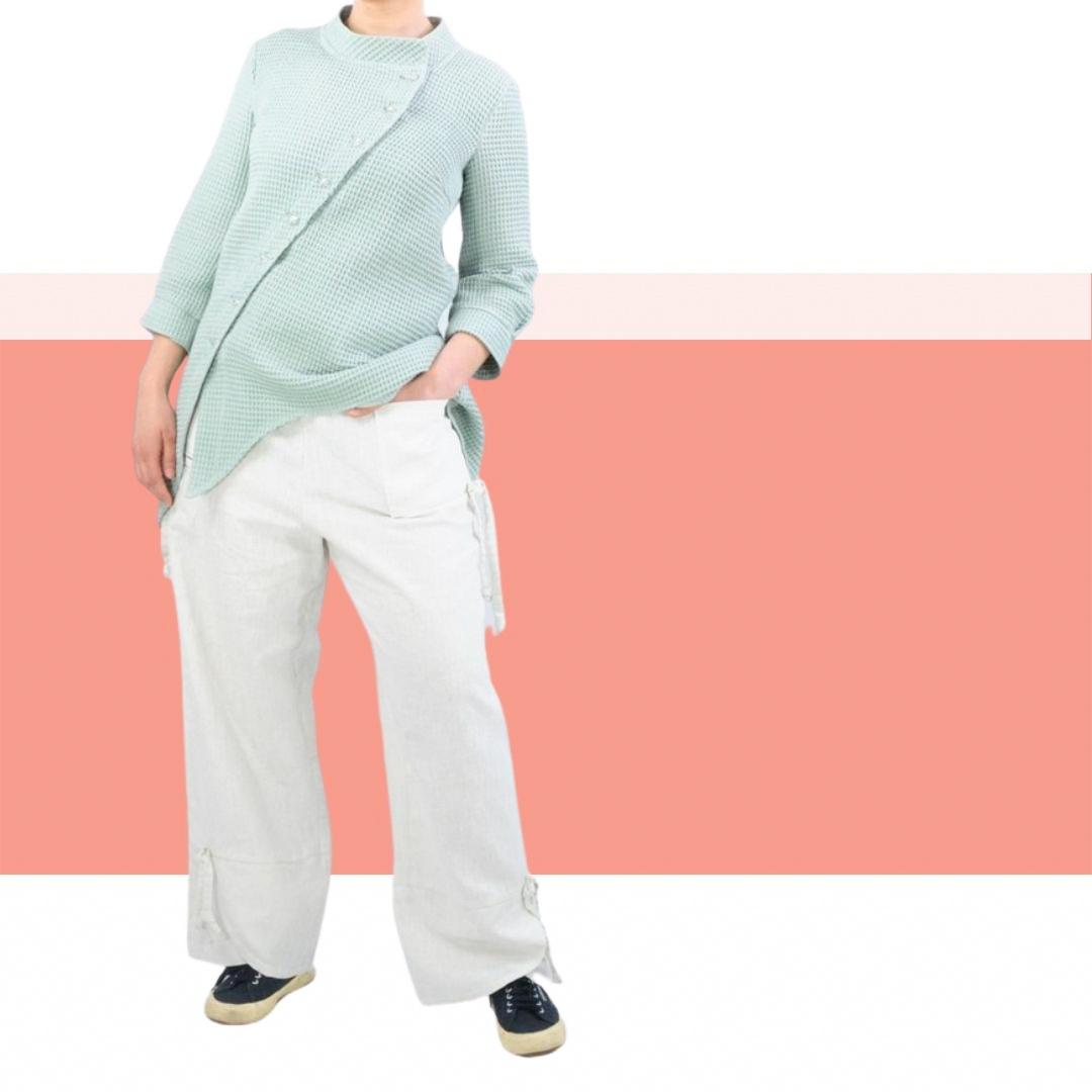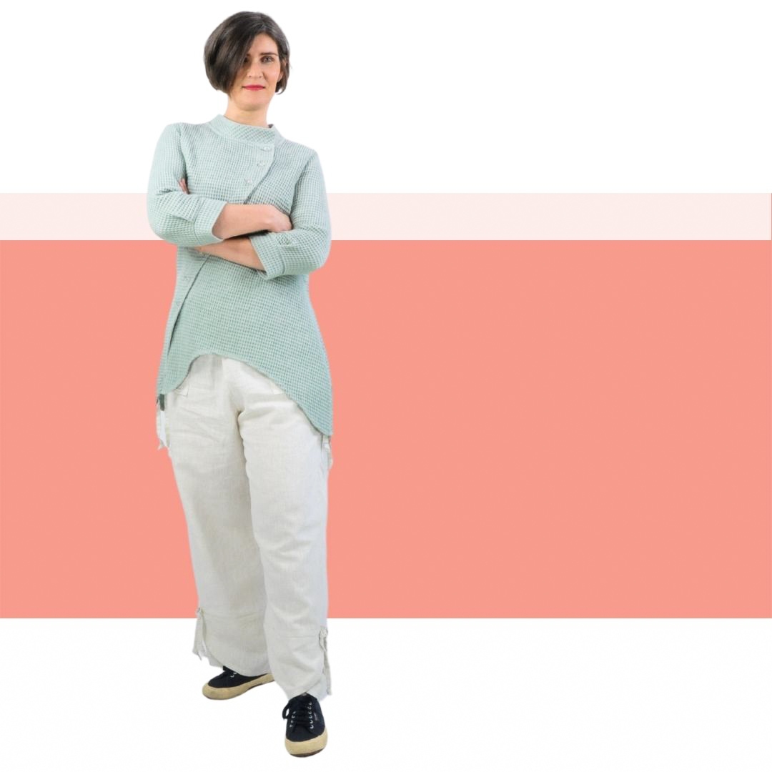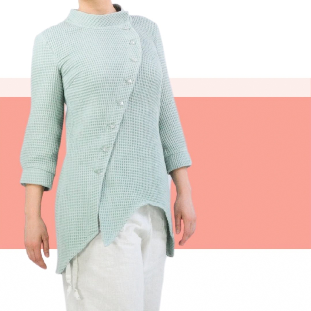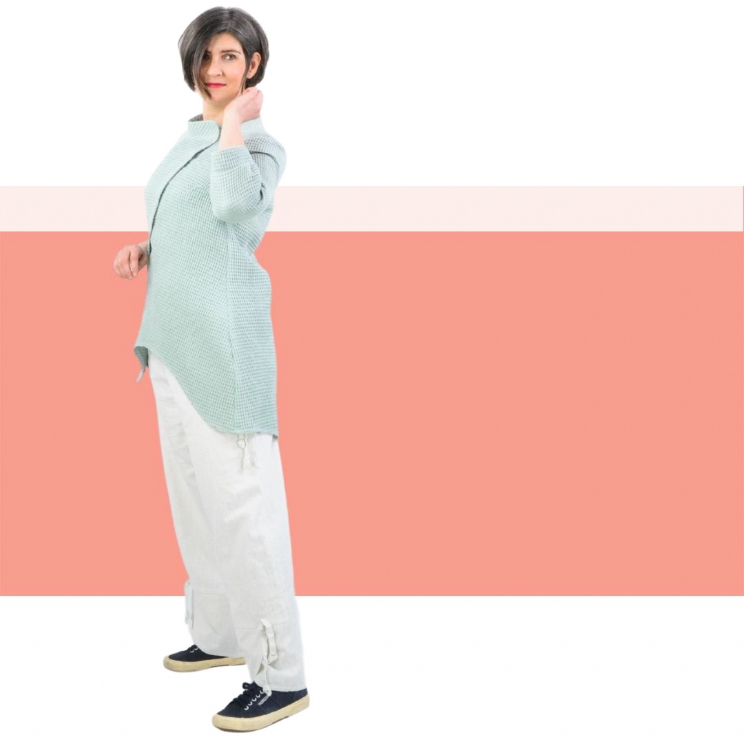 Das Schnittmuster Belle ist eine asymetrisch geschnittene Longbluse. Der asymetrische Knopfverschluß besticht die Schnittführung und sieht super toll zu Hosen und zu Jeans aus. Ein Stehkragen rundet die Ansicht ab. Die Ärmel sind nicht ganz lang und mit angenähten Bündchen/Manschetten versehen.