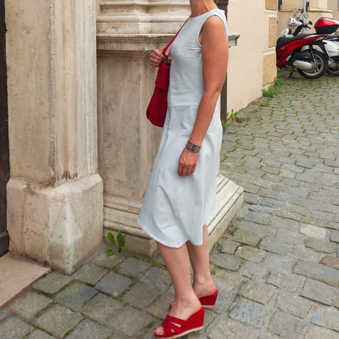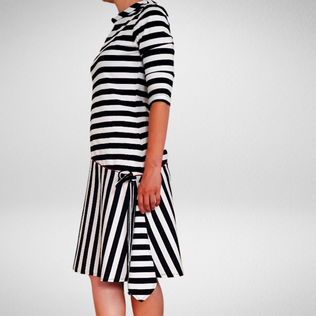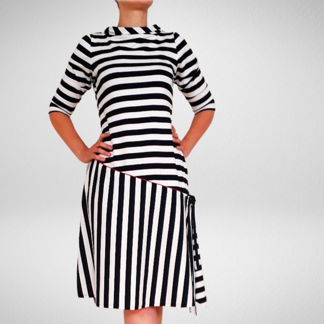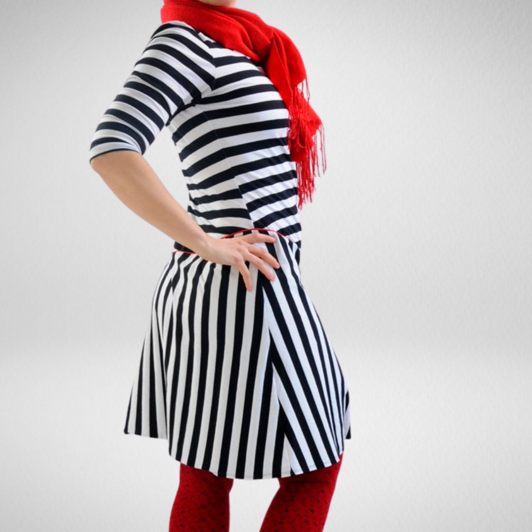 Das Schnittmuster Giselle ist ein schlichtes Jerseykleid für Damen im 20er Jahre-Stil. Im Rockteil ist eine Godet-Falte eingearbeitet. Das Oberteil ist asymmetrisch und sehr schlicht gehalten, dadurch verlängert sich optisch der Oberkörper. Ein gute Möglichkeit ist, das Kleid mit „Jersey-Nudeln“ zu akzentuieren. In der schwarz-weissen Variante haben wir eine rote Paspel mit eingearbeitet. Das Kleid kann auch mit Ärmel genäht werden, so dass es auch im Herbst/Winter getragen werden kann.