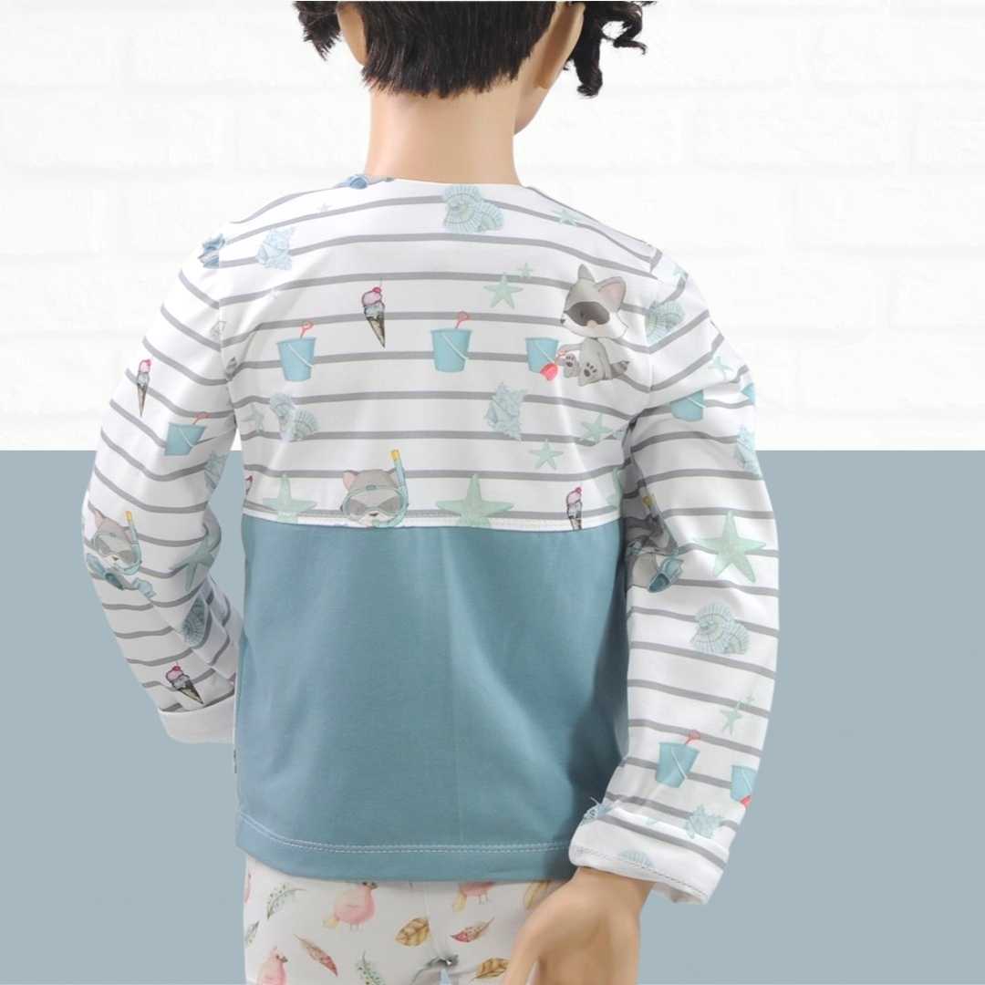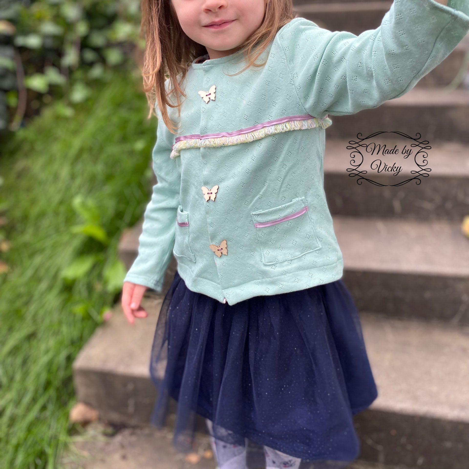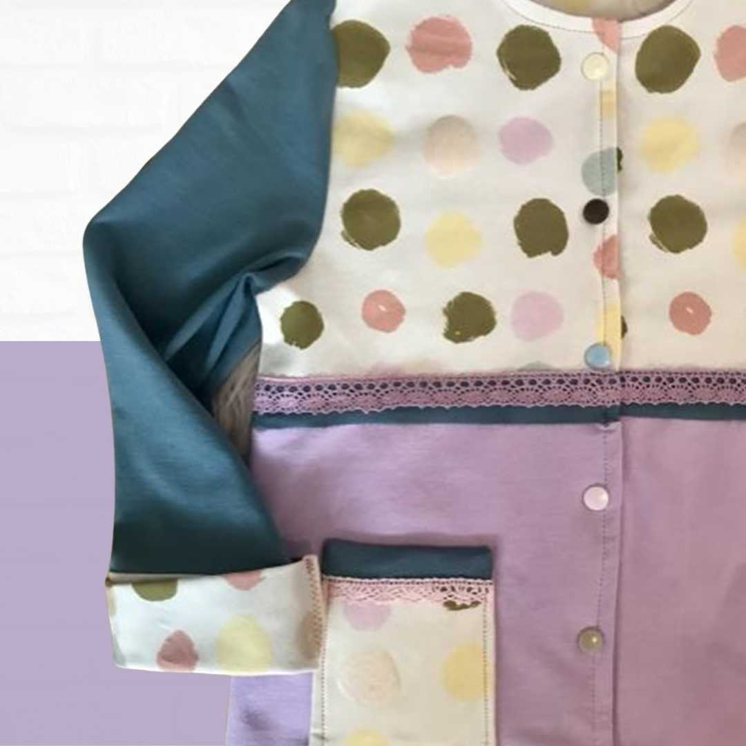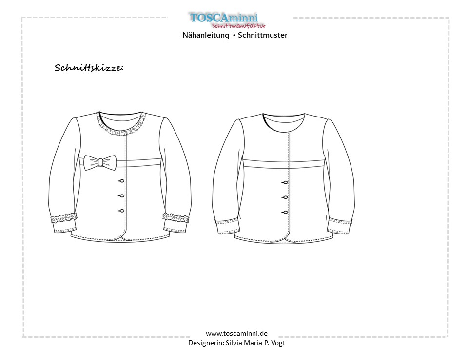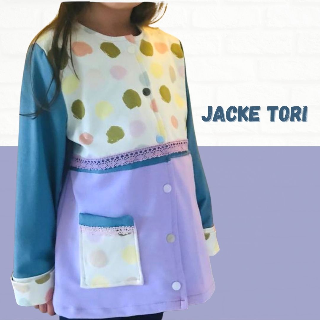 Mit dem Schnittmuster Tori nähst Du eine einfache Kinderjacke für kühlere Tage. Die Jacke ist für Mädchen und Jungs und hat zwei Varianten – einmal gerade geschnitten und einmal ausgestellt. Durch die Passe kannst Du Stoffe kombinieren und mit tollen Hinguckern, wie Schleifen oder Borten versehen. Der Ausschnitt ist bewusst schlicht gehalten und wird mit Belegen versäubert. Die Ärmel sind extra lang, damit sie umgeschlagen werden können. Wer mag, kann noch kleine Aufsatztaschen anbringen, die mit dabei sind.