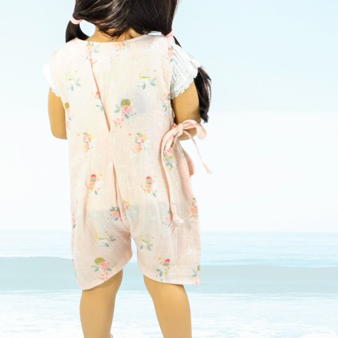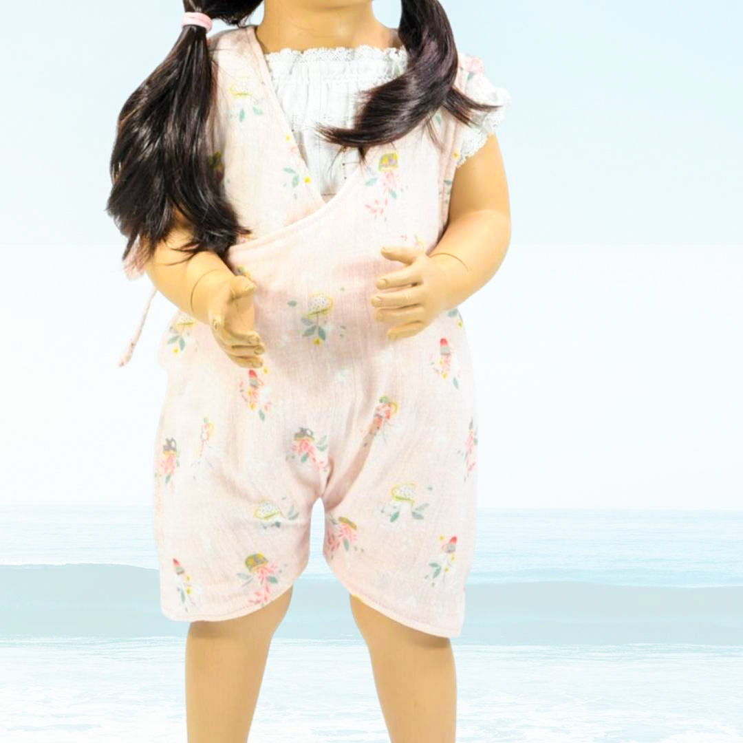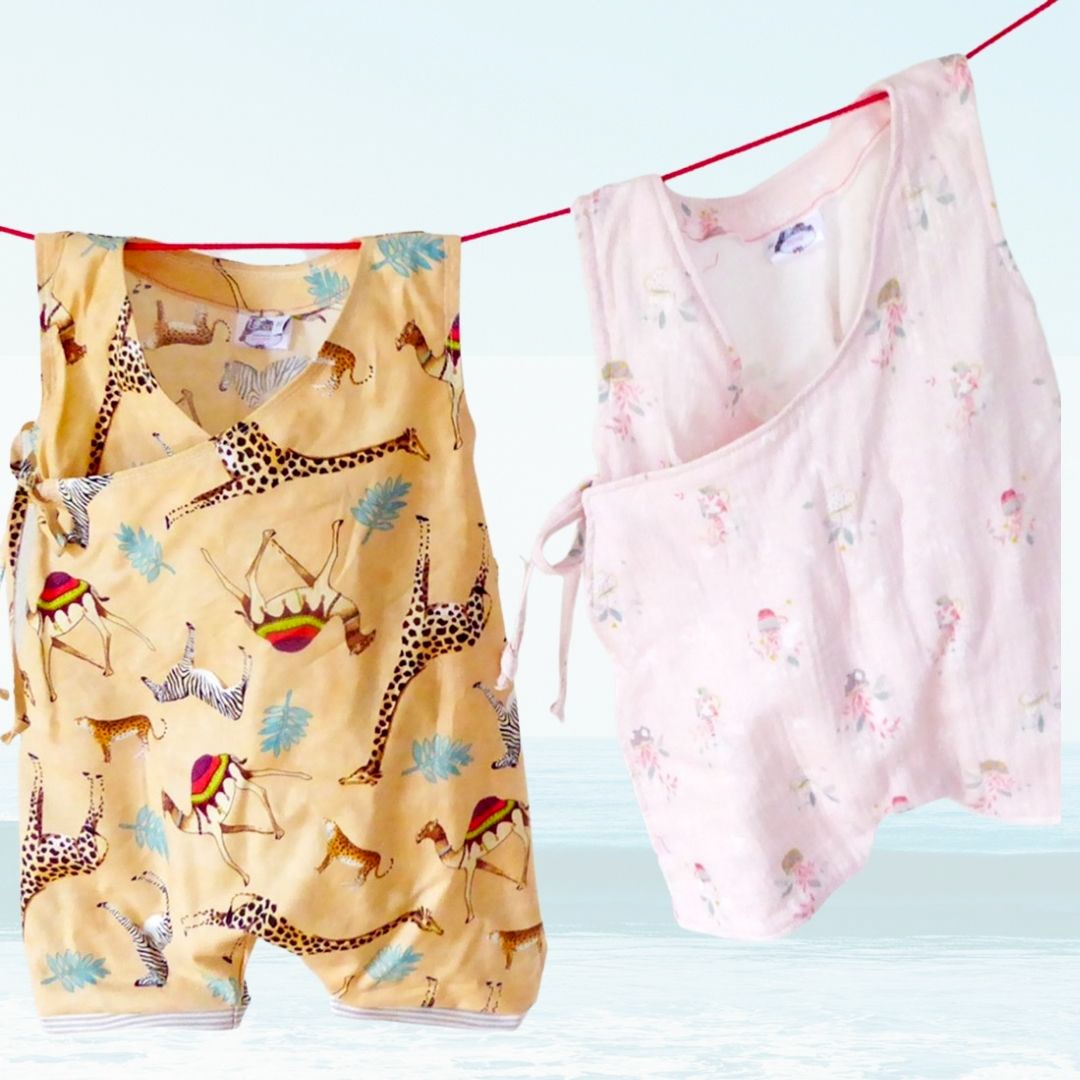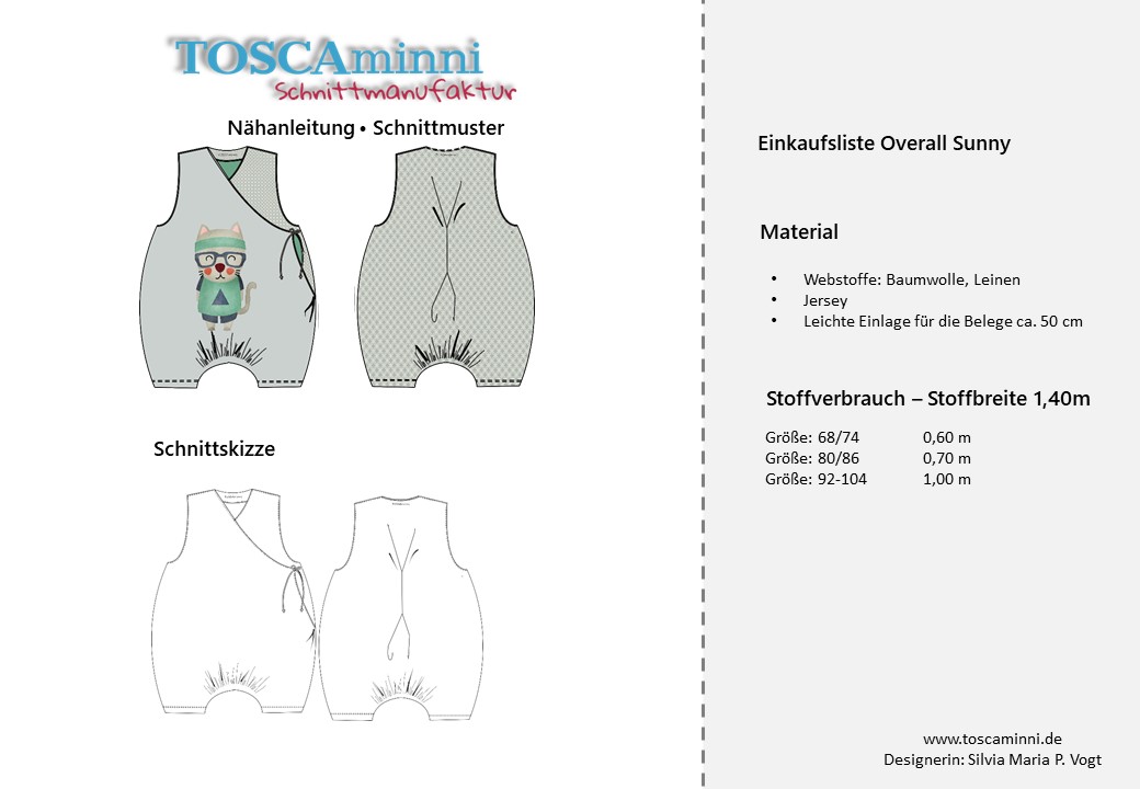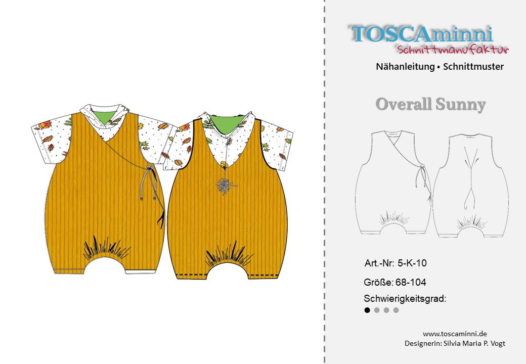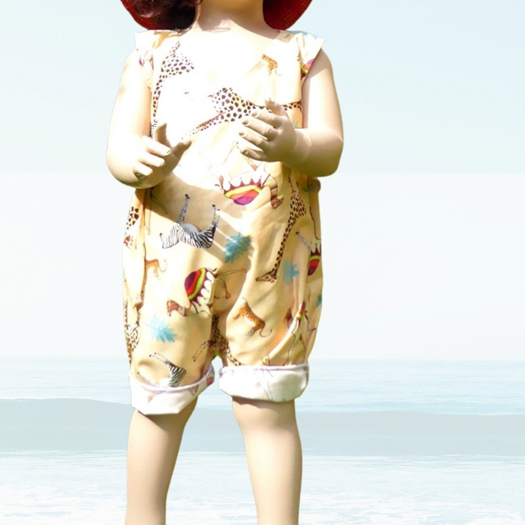 Das Schnittmuster für den Jumpsuit Sunny, ist ein kleiner Minianzug für hochsommerliche Temperaturen. Der Overall kann aus Webstoffen und aus Jersey genäht werden. Wir haben Webstoffe und Musselin verwendet. Der Overall wird auf der Seite gebunden. Hingucker ist die asymmetrische Verarbeitung.