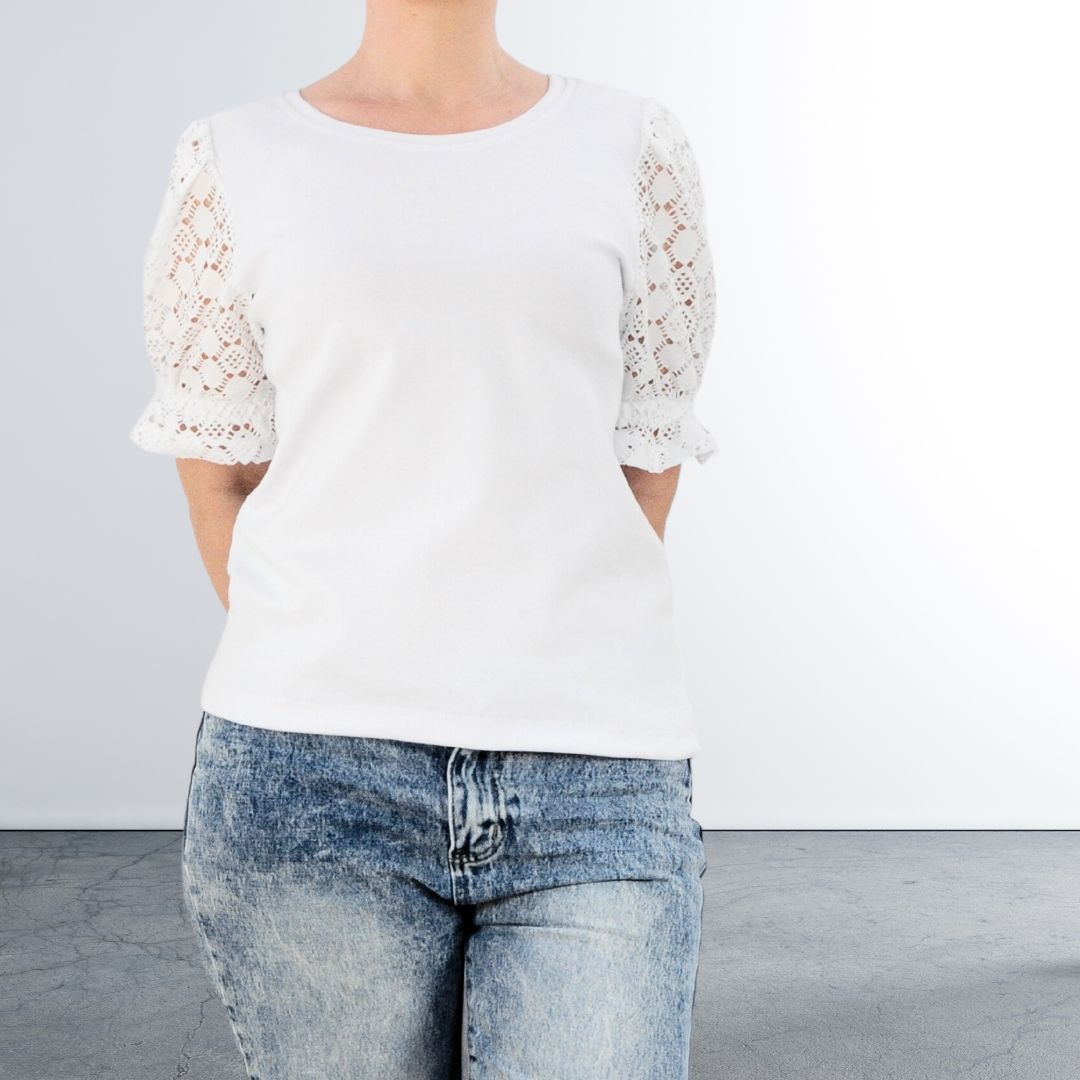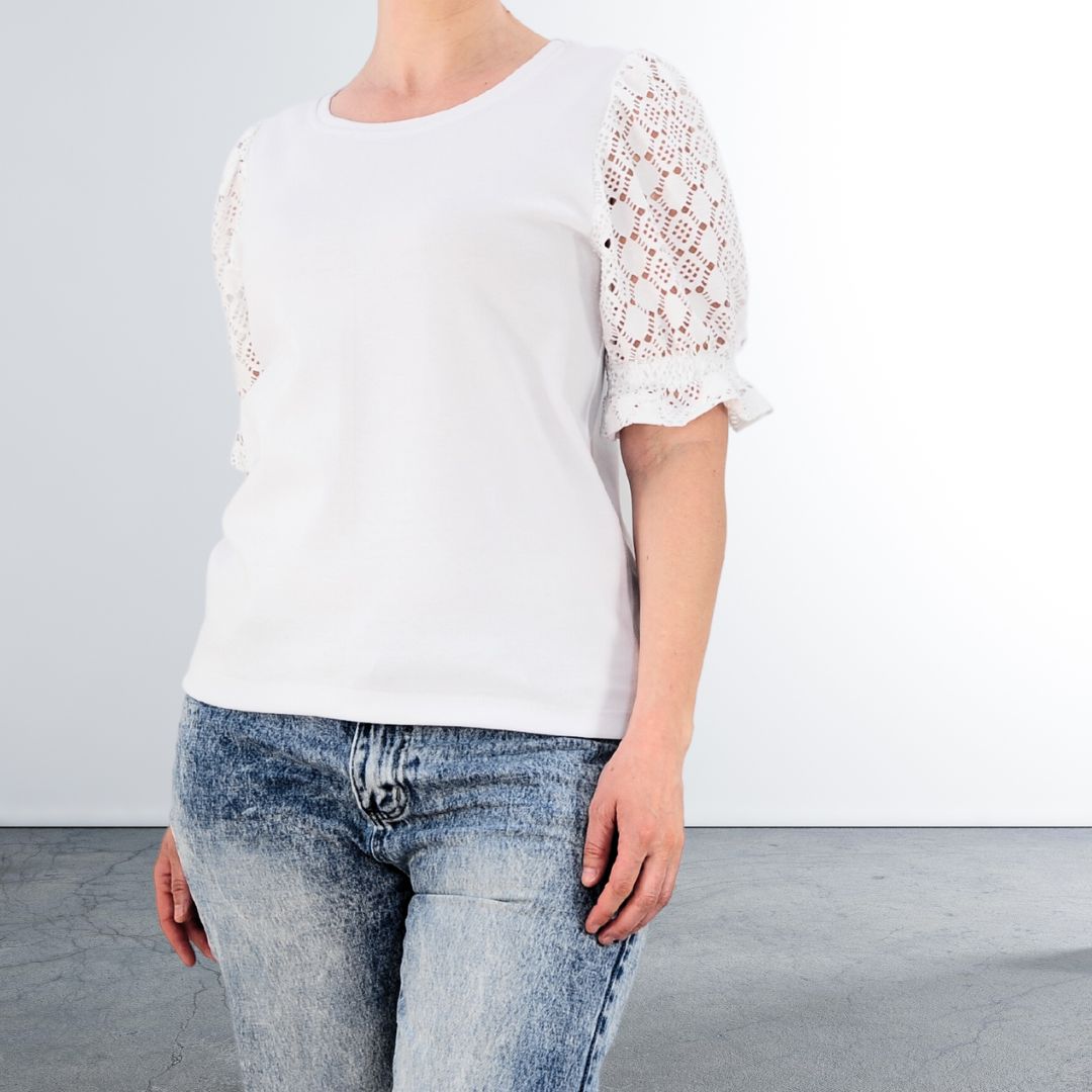 Der Korpus des Shirts wird aus Jersey gefertigt, der angenehm auf der Haut liegt. Der Halsauschnitt wird mit einem klassischen Bündchen versäubert. Für die Ärmel kannst du entweder den passenden Jersey in Strickoptik verwenden oder kreativ sein und sie mit Webware kombinieren. Lass dich von der Lochstickerei und den verspielten Puffärmeln inspirieren und erschaffe ein außergewöhnliches Shirt, das leicht zu nähen ist und trotzdem dem trendy aussieht und so deinen Kleiderschrank bereichert.