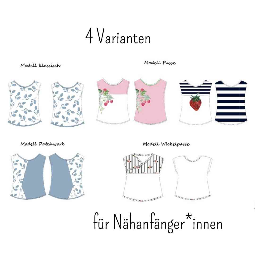 Mit dem Shirt Belanna nähst Du Dir ein kurzärmeliges Fledermausshirt bzw. ein Shirt mit Flügelärmel. Das Shirt ist leger geschnitten, so dass es perfekt luftig für den Sommer ist. Du hast die Qual der Wahl mit 4 aufregenden Varianten, die du nach deinem persönlichen Stil gestalten kannst: Entscheide dich für die klassische Ausführung, verleihe dem Shirt mit einer Passe einen raffinierten Touch, wähle die faszinierende Wickeloptik oder wage dich an den angesagten Patchwork-Look. Und für alle, die es gerne etwas enger mögen, bietet sich die Möglichkeit, einfach die Seitennähte abzunähen – kinderleicht und schnell umsetzbar.