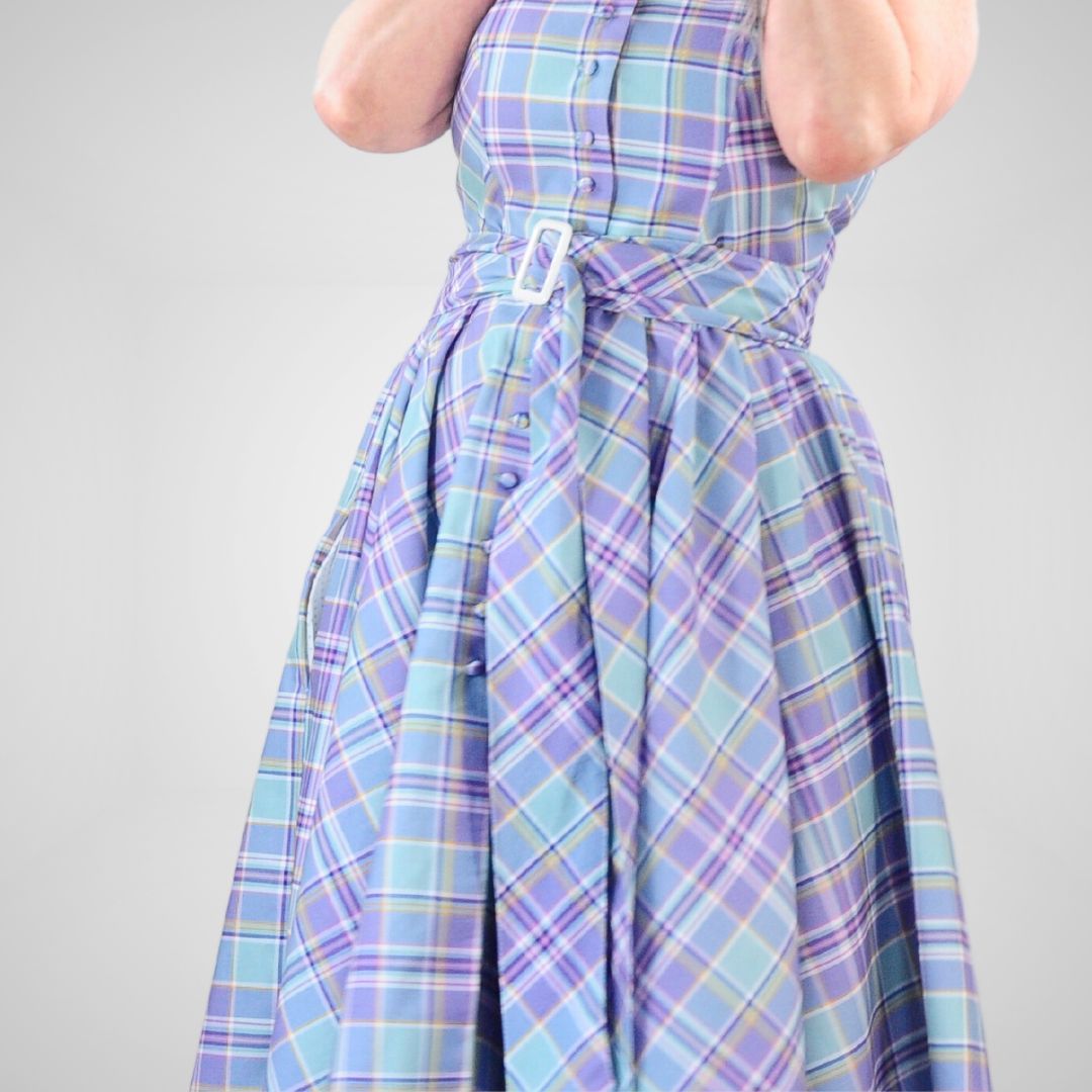 So habe ich ein Schnittmuster kreiert für ein Vintagekleid, das genau meinen Vorstellungen entsprach. Der Tellerrock ist in 2 Weiten angefertigt und das Oberteil mit verscheidenen Ärmelvarianten versehen (nicht jeder mag ja ärmellose Oberteile). Wir starten mit der ärmellosen Variante und werden später die weiteren Varianten zeigen. Im Schnitt sind bereits alle Elemente enthalten, so dass Du wählen kannst. Der Tellerrock wirkt besonders interessant mit einem schönen Streifenmuster oder auch Karos, weil der Fadenlauf einmal gerade und einmal schräg verläuft. Den Gürtel, der zu diesem Kleid gehört, will ich hier schnell einmal beschreiben, wie dieser genäht wird, weil er auch zu vielen anderen Projekten passen könnte und evtl. fehlt Dir ja noch ein besonderes Accessoire.