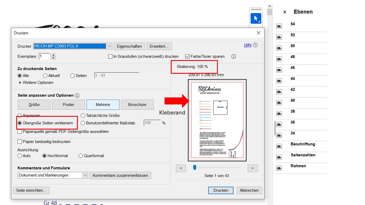 Jeder Drucker wird etwas anders eingestellt, deshalb können wir Dir hier nur Tipps geben, wie es bei uns funktioniert und was sich aus der Probenähgruppe bewährt hat. Wir haben einen Drucker von Ricoh und wählen hier die Einstellung „übergroße Seiten verkleinern“ – die Skalierung beträgt 100%. Bei Deinem Drucker ist die Einstellung vielleicht anders und Du musst zum Beispiel die Einstellung „tatsächliche Größe“ anwählen. So sieht es bei uns aus: